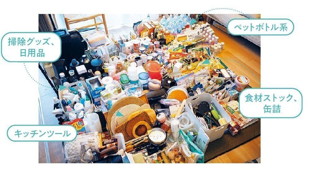 あらゆる収納から物を出して更地(家具以外の物が一切ない状態)にすると全体の物量が把握しやすい!布川さんちも全出ししたらこの通り。「収納が少なめな割に詰め込んでたね~!そりゃ使いづらくなるわ(笑)」。