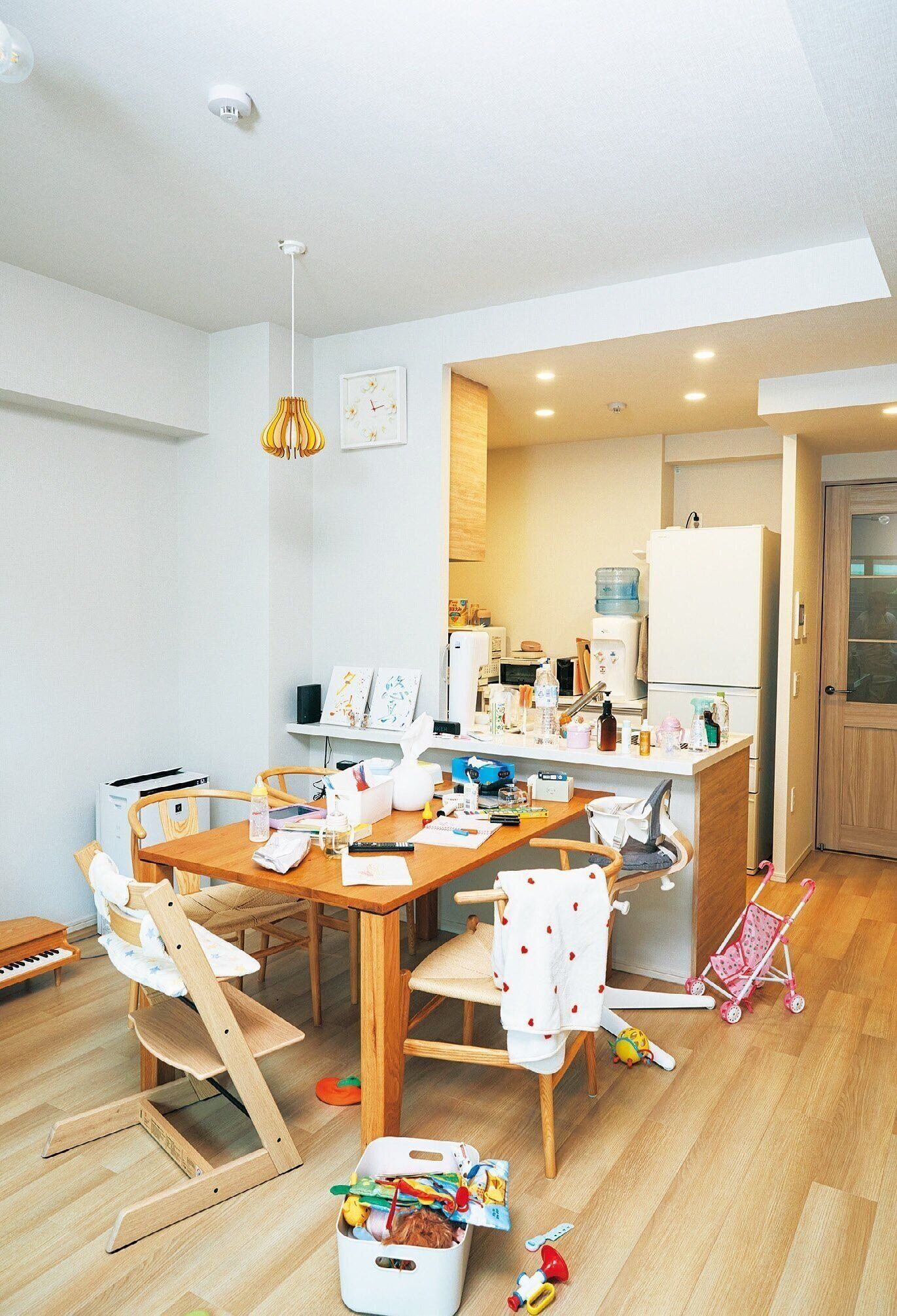 ダイニングテーブルやキッチンカウンターの上はちょい置きの嵐!「使った物を戻すのが手間で気づくと部屋中がカオスに(涙)。毎日、探し物してばかりだし片づけも家事もスムーズにできなくて、もうお手上げです」(布川さん)。