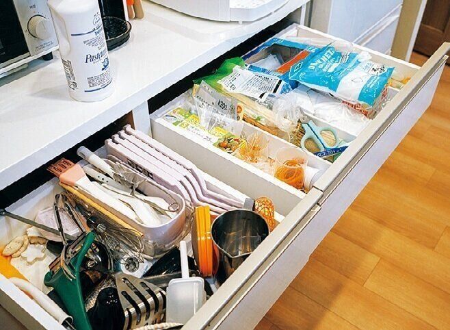 ぎゅうぎゅうの収納の中はいろんなジャンルの物が混在してるから仕分けが大事。キッチンならば、物を外に出しながら食器はこっち、食材はあっちと分類しておくと、後で使う物を選びやすく戻しやすい!