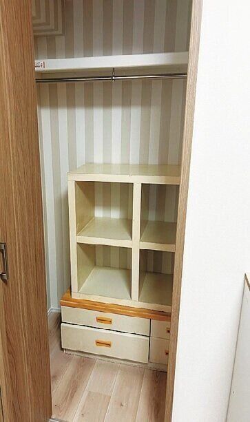 今着る服はトップスとボトムスを分けて畳んでかごにしまい、季節外やおさがりの服は高い所に埋めました。