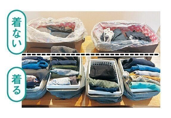 「季節外、小さい、破れている、まだ大きいおさがり服」と、「今着る服」に分けました。