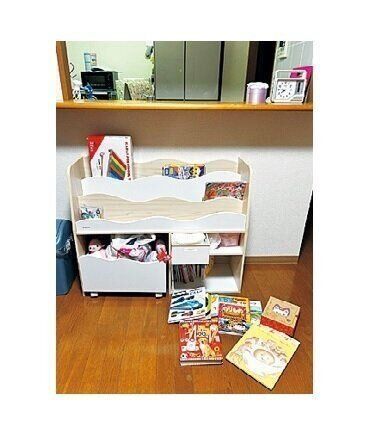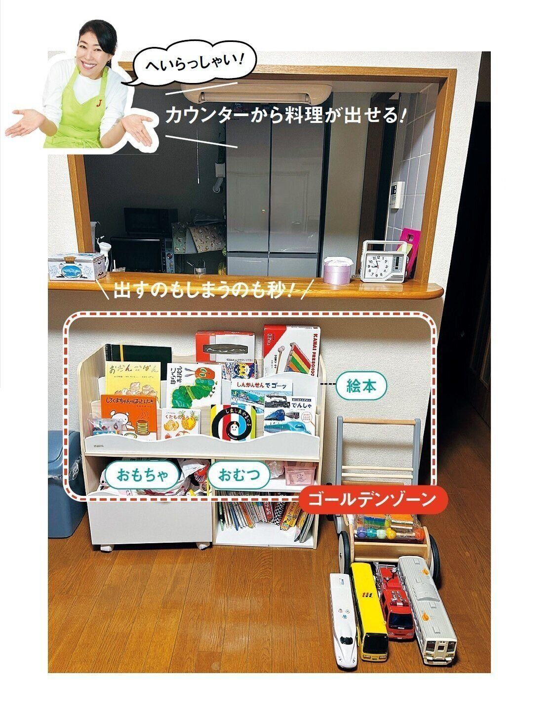 リビング収納が整ったら、キッチンカウンターと絵本棚周りも同時に片づきました。景色もよくなったし、2歳の息子が自分で絵本を出し入れできるようになってうれしい!