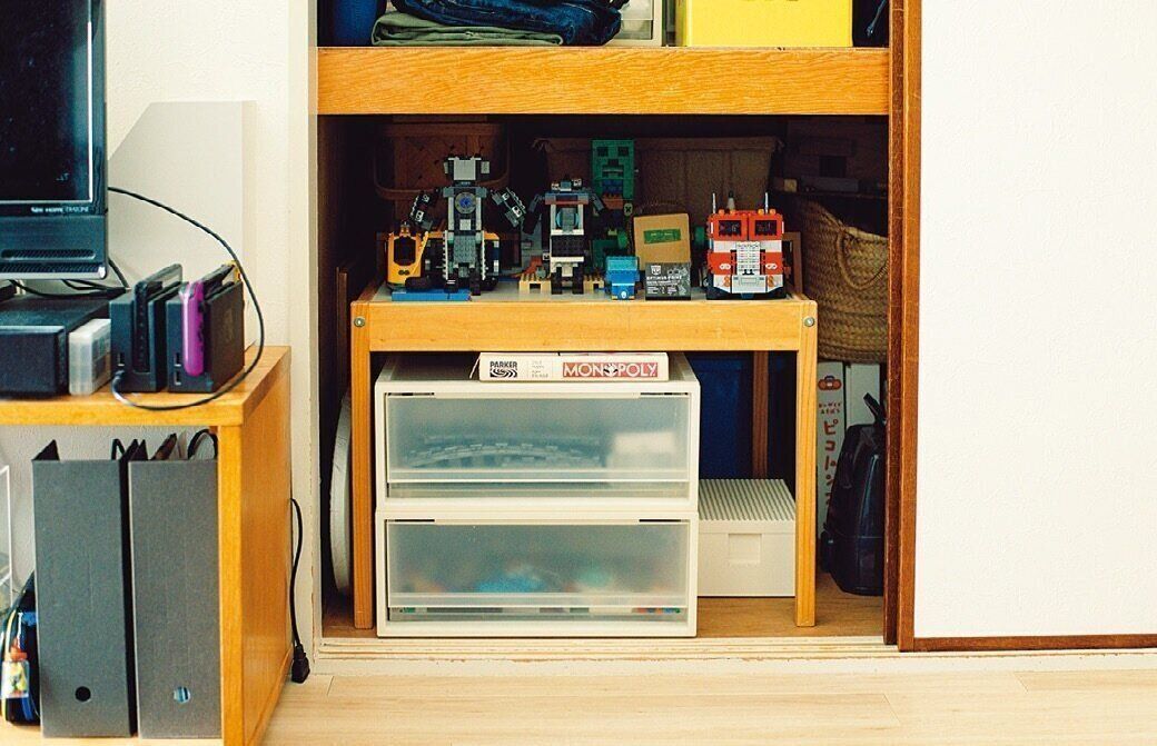 完成作品は押し入れに置いたテーブルの上が定位置。「飾りたい!と言われたらここへ。制作中の物の一時置き場もあるので、床に放置がなくなりました」。