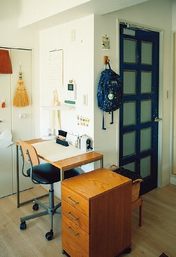 リビングの入り口付近にある子どもたちの机。引き出しは机の下に置けるけど、あえて机の横に並べ、ランドセル置き場に。登校時もパッと背負えてラクチン。