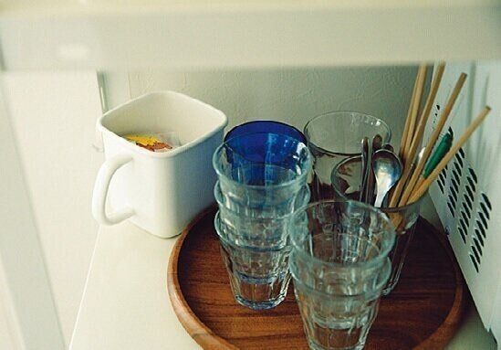 3段目が子どものゴールデンゾーンなので、おやつのアメを常備して自由に取れるように。「コップもここに置けば、お茶やジュースも自分たちで用意できます」。
