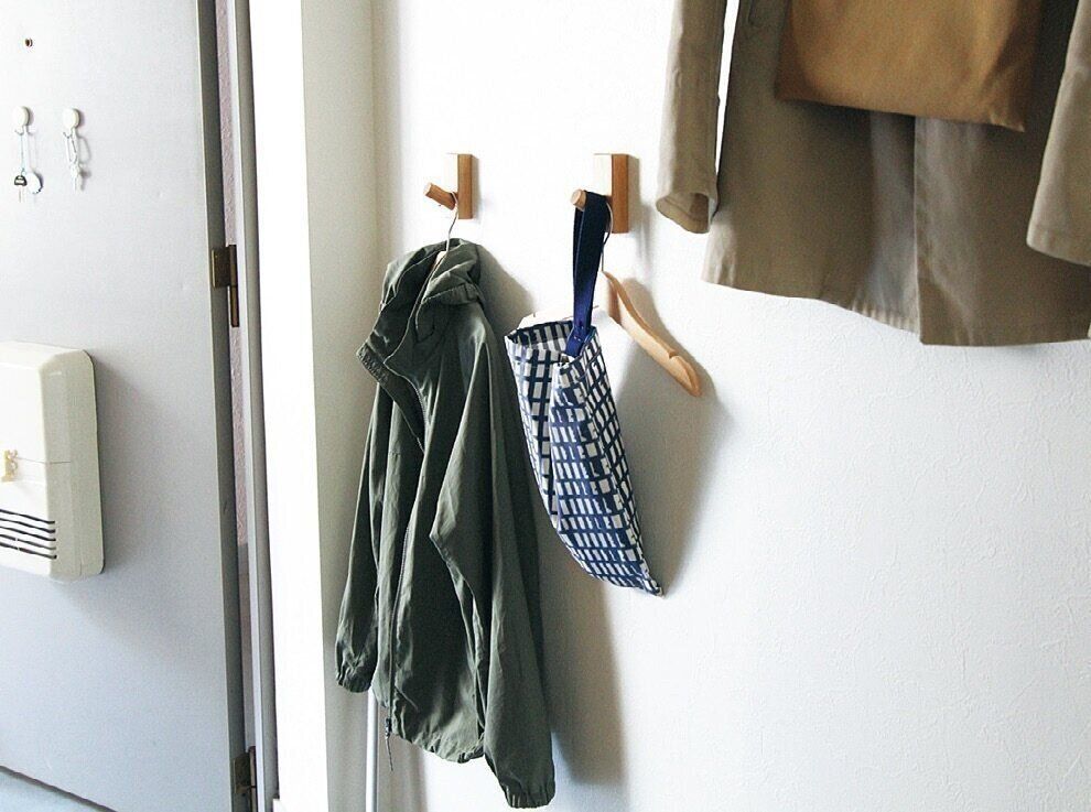 上着掛けのフックは大人と子どもで位置を変え、目線の高さに。休日に洗った上履きも、ここに吊るせば月曜に忘れず持っていけます。