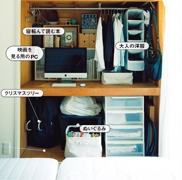 ベッド下と天袋は今使っていない物を閉じ込める「へき地」スペース。押し入れは上段に大人が使う物、下段に子どもの物を置いて取り出しやすくし、臨時の学用品置き場として余白を確保。