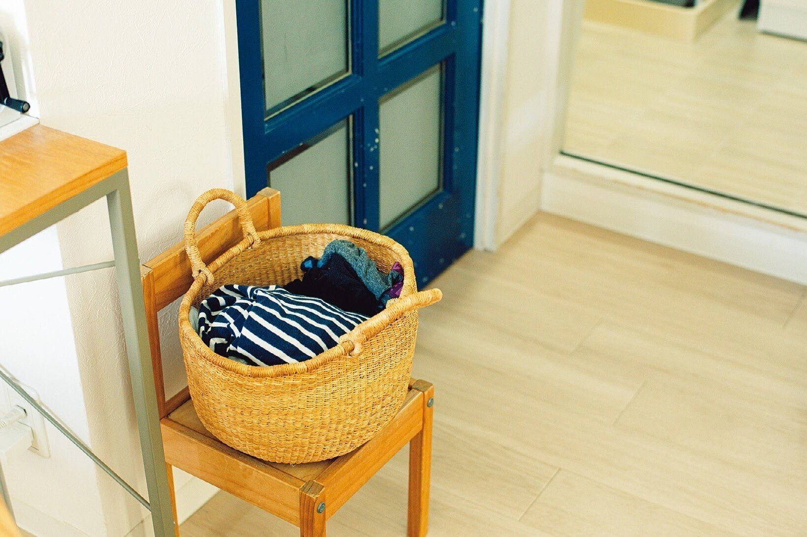 子ども達が浴室に向かう道すがらパジャマと下着を持っていけるよう、ドア前に椅子を置き、かごを設置。翌朝脱いだパジャマも、ポイッとここに戻すだけ。