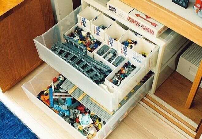 収納ケースに牛乳パックを切って入れ、おもちゃの細かいパーツ入れに。遊ぶときも片づけるときも取り出しやすいと子どもたちに好評。
