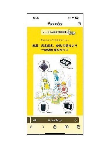 パーソナル防災サービス「#pasobo」で防災診断をすると、住んでいる地域や家族構成などに合った防災グッズや、周辺のハザードマップが確認できます。