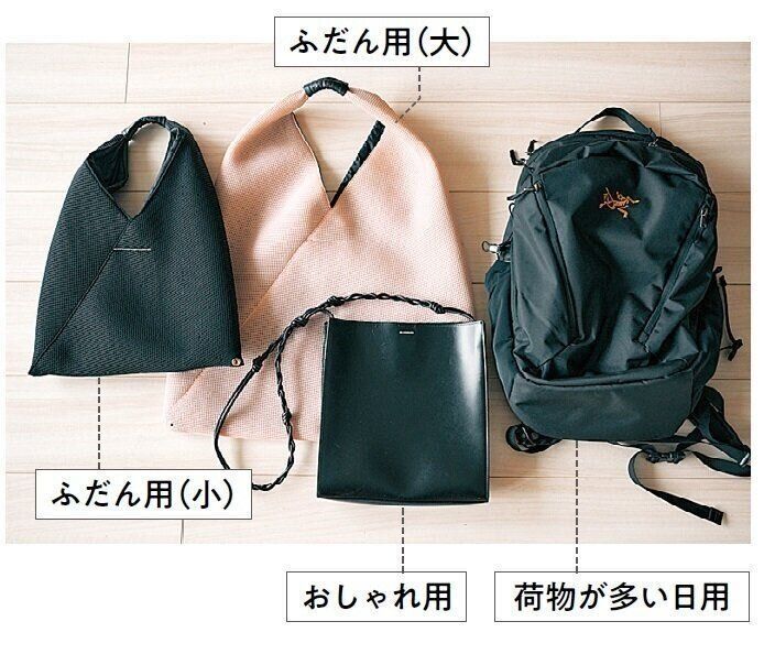 白い布のトートバッグだけだった頃は式典などかしこまった場面で困ったことが。それ以来バッグは用途別に1つずつ揃えることに。買い物用のエコバッグは、これらとは別に持っています。