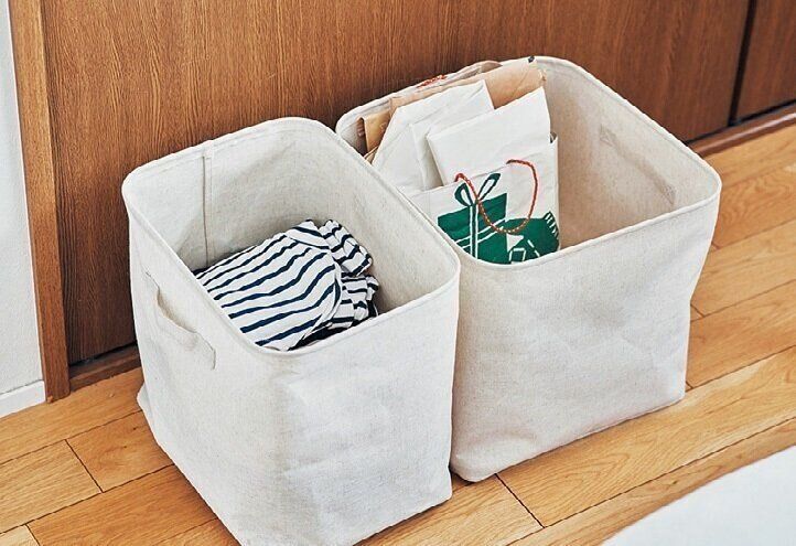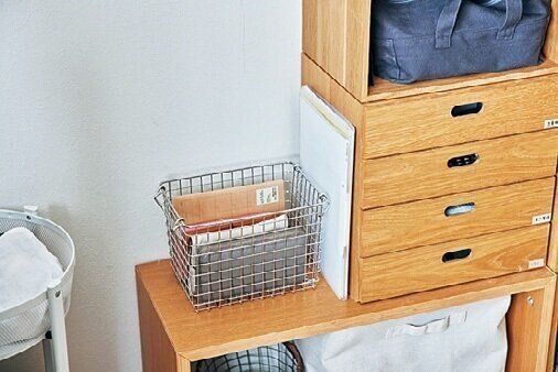 不用品を見つけたら、この箱にIN。紙袋やガムテープなどの梱包グッズを入れた箱とセットで置いておきます。「不用品をまとめておくと出品がラク。物が減って、お金も稼げてまさに一石二鳥」。
