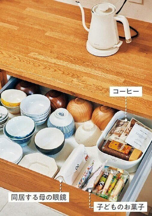 ダイニングに一番近い引き出しなので、よく手に取る物を収納。母親がこの場所で充電しながらスマホをチェックするので眼鏡はココに。よく飲むコーヒーも、ケトルの近くのココを定位置に。