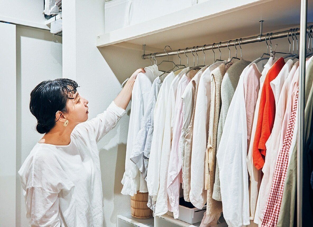 「着用後、洗濯した服を左端にかける」を繰り返すと、着用頻度の少ない服が、自然と右側に寄せられていきます。「着なくなった服が目で見てわかるので、迷わず手放すことができます」。