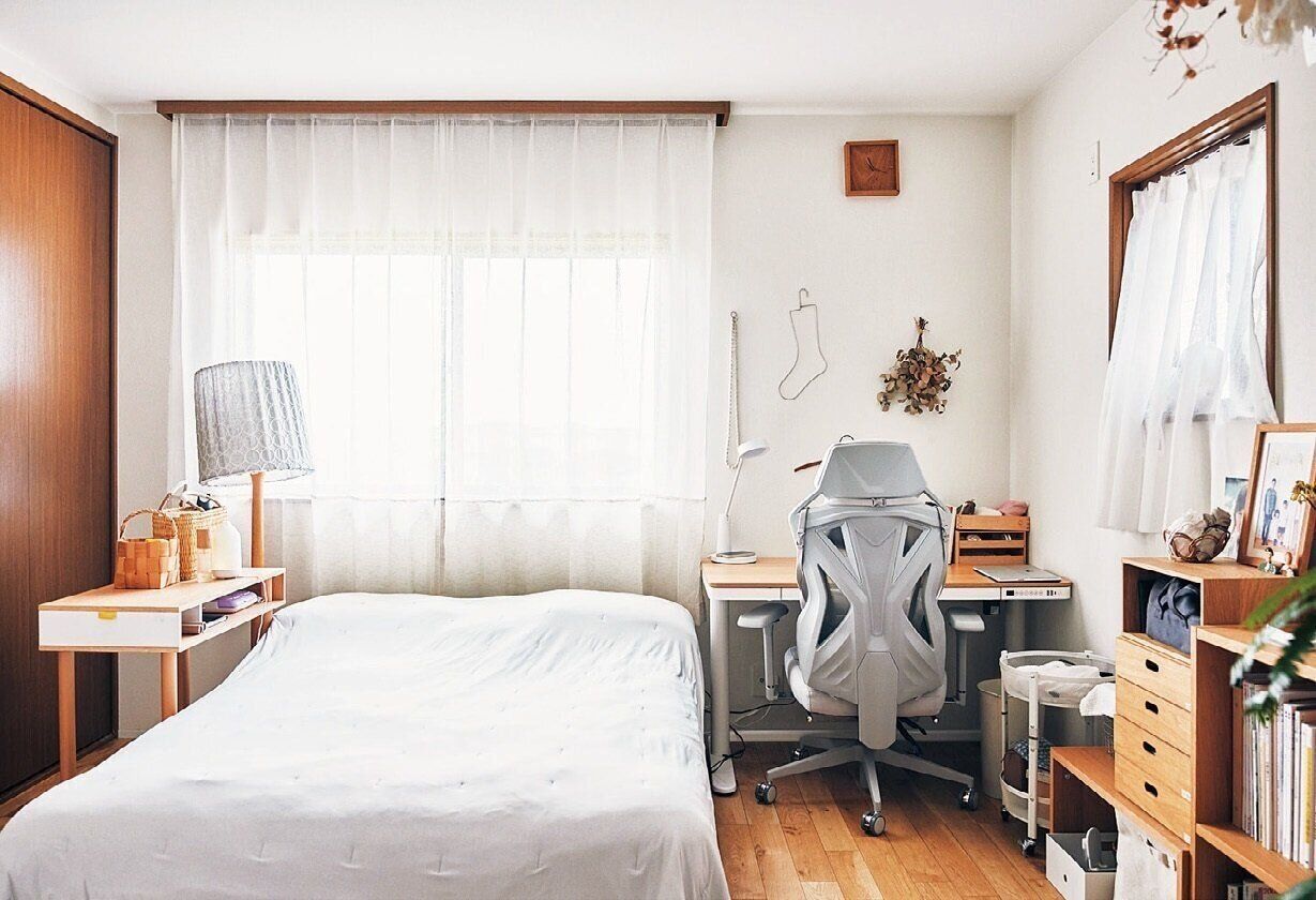 寝室に置いたデスクでメイクをします。1日1回必ず座るので、座ったついでに家計簿をつけるのが習慣に。「引き出しの中にしまわず、すぐ目について、片手を伸ばすだけで取れる位置に置いてます」。