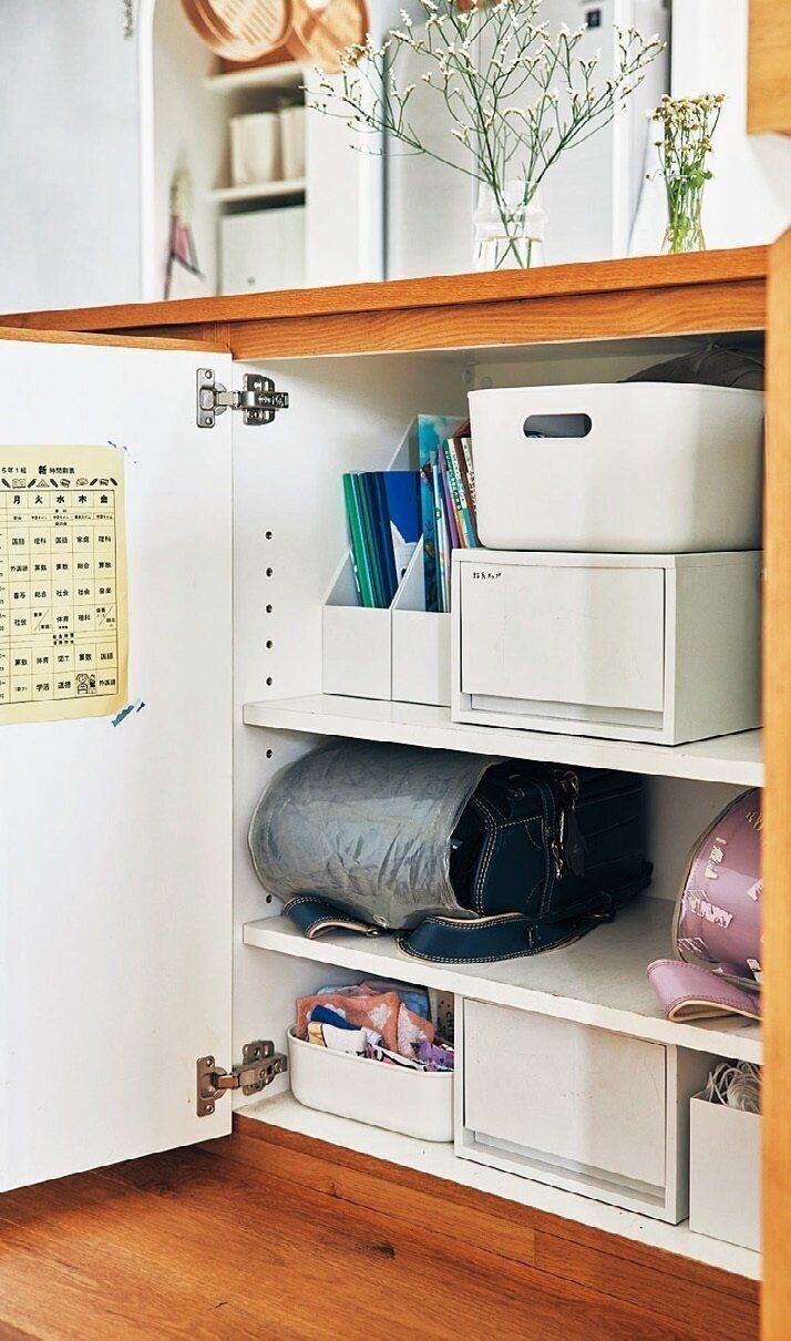 キッチンカウンターの下は、子どもの学用品を収納するスペースに。「宿題もリビングでするので、ここにしまうと出しやすくて、しまいやすい。出しっぱなしがなくなりました」。