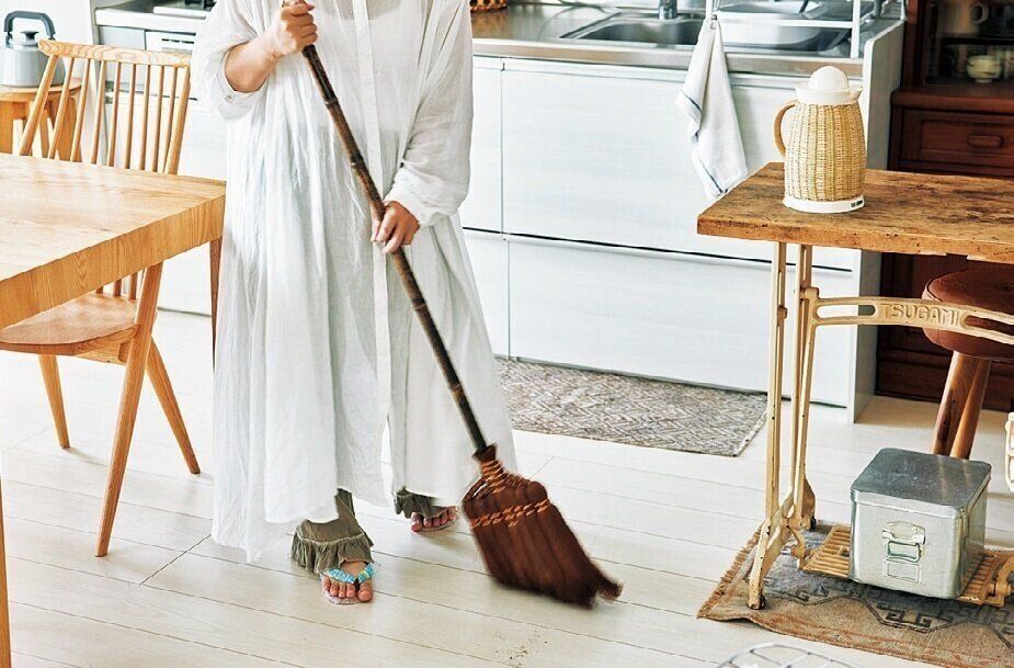 「掃除機と違ってほうきは音が出ないから、子どもが寝たあとでもササッと床を掃除できて助かります」。床板の溝の細か~いゴミまでキレイに取れるからスッキリ!