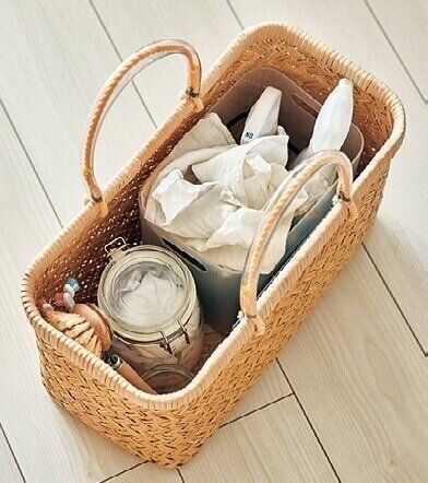 ミニタオルやスタイはシワになっても平気なので、たたまずかごにポイッ。「その方がラクだし、赤ちゃんのお世話グッズは棚一つにまとめておけばスッキリ見えます」。