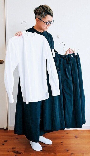 「元々服が好きでなかなか減らせなかったけど、普段着を制服化したら、うまくいきました」。週3日のパート用は2コーデ、残りの4日で2コーデの基本パターンを決め、シーズンごとに入れ替えています。