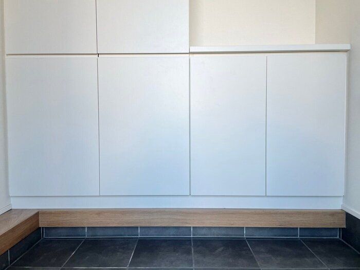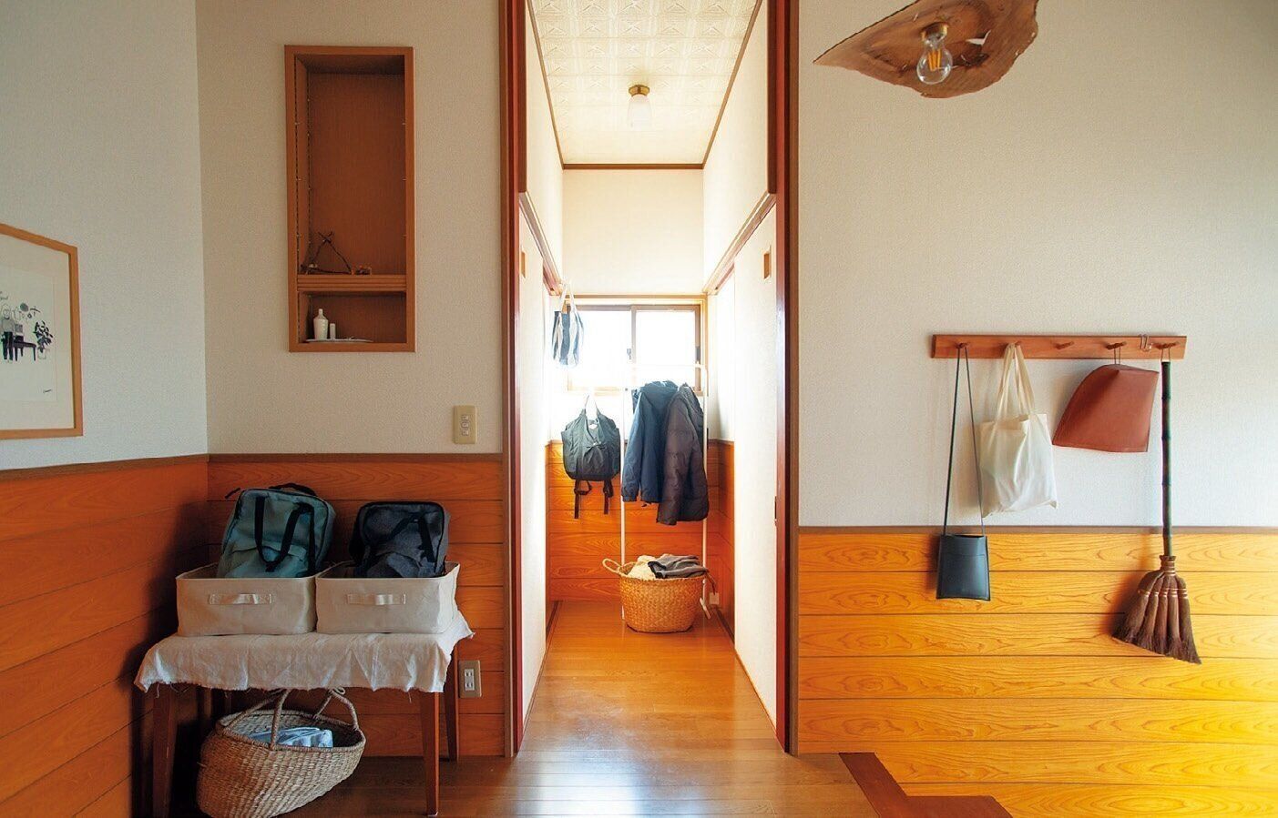 「玄関前の廊下に上着置き場をつくったら、リュックを下ろさないと上着が脱げないことがわかり、リュック置き場もつくりました」とmahoさん。これで置きっ放し、脱ぎっ放しがなくなりました。