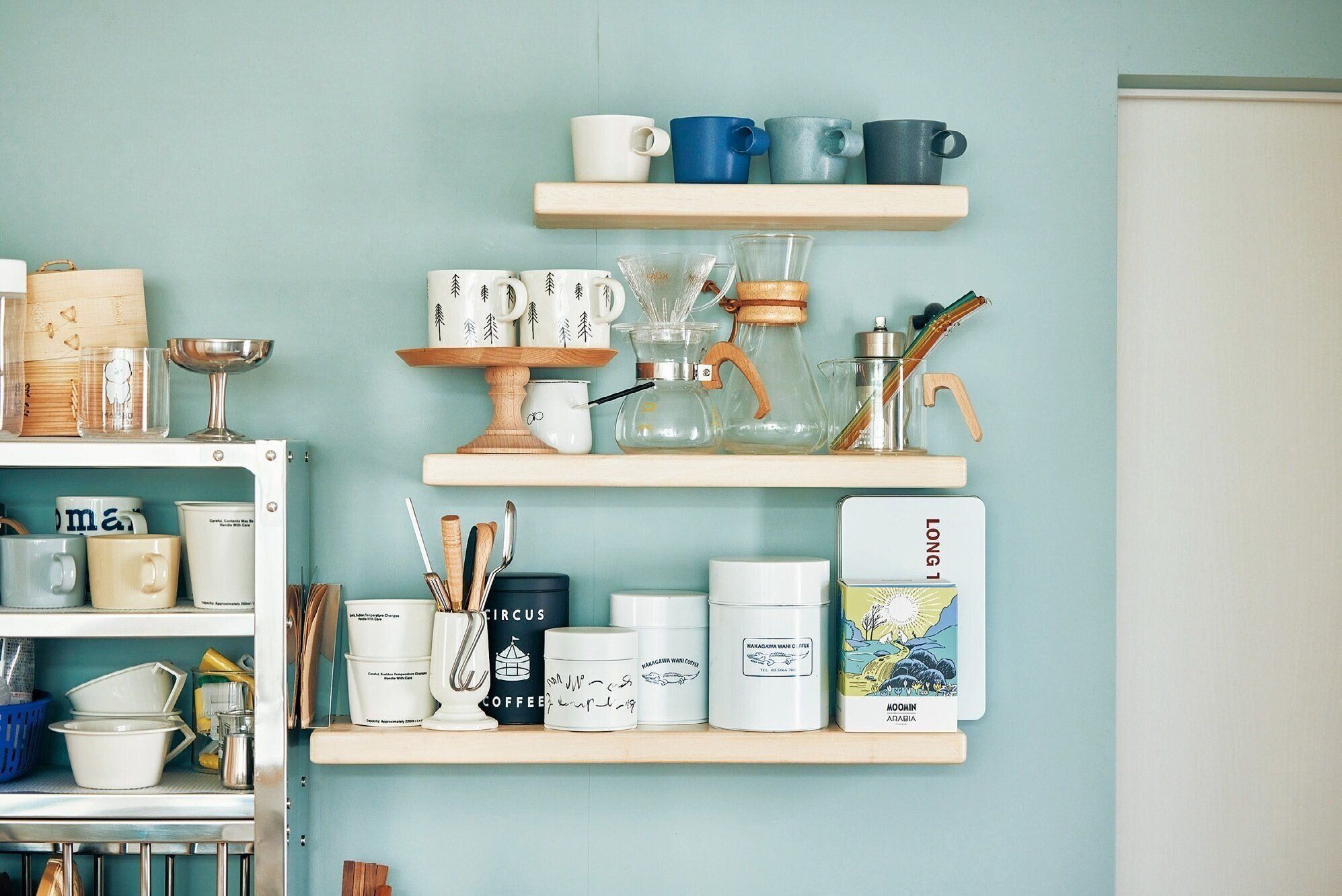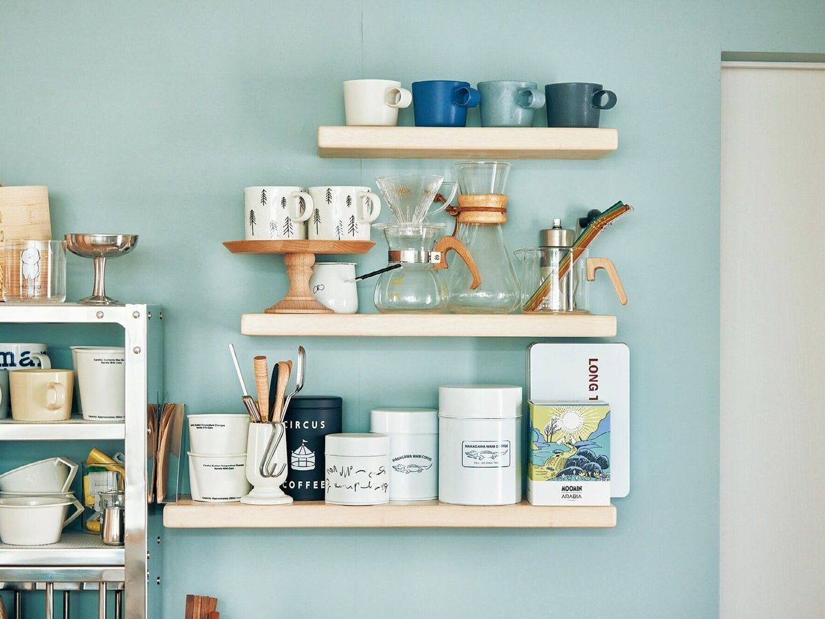 大好きなティーセットやマグカップはキッチンのウォールシェルフに集め、眺めて幸せなコーナーに。使用頻度が高いので、すぐ手に取れるのもうれしい!