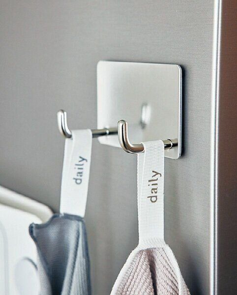 「店頭で見つけた『ステンレス壁につける収納 フック2連 マグネットタイプ』は、フック部分が長めで掛けやすいんです!食器拭きも掃除道具も、もたつかずにサッと戻せます」。