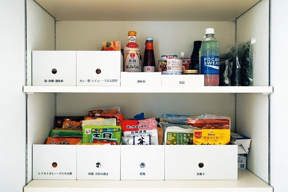 面がピシッと揃うのが気持ちよくて、収納グッズは無印良品で統一。白いボックスのラベリングは、私の不在時でも物の場所がわかるよう、家族にヒアリングして決めました。