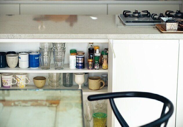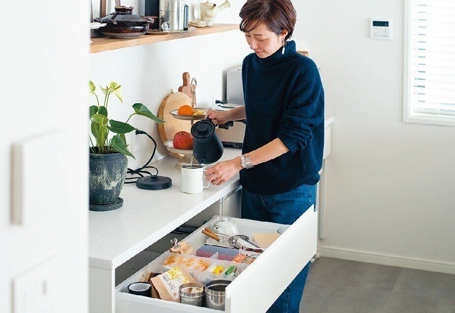 調味料はダイニングの椅子に座ったまま、手を伸ばせば取れる棚に。お茶などはキッチンの一番上の引き出しにまとめ、ポットも近くに。かがまずにお茶が淹れられてラクです♪