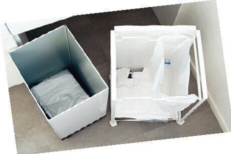 洗濯物を干す場所もしまう場所も洗濯機のすぐ横。またゴミ袋はゴミ箱の底に収納。これならほぼ動かずに洗濯やゴミ袋の交換が完了します。