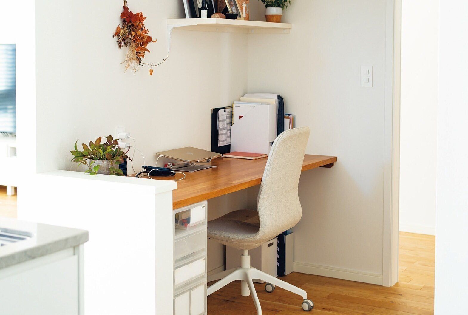 帰宅したら買い物袋やリュック、上着、帽子や郵便物などもひとまずここに置き、夕食の支度後、定位置に戻します。書類のチェックや仕事もこの作業スペースで。