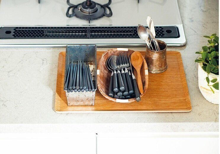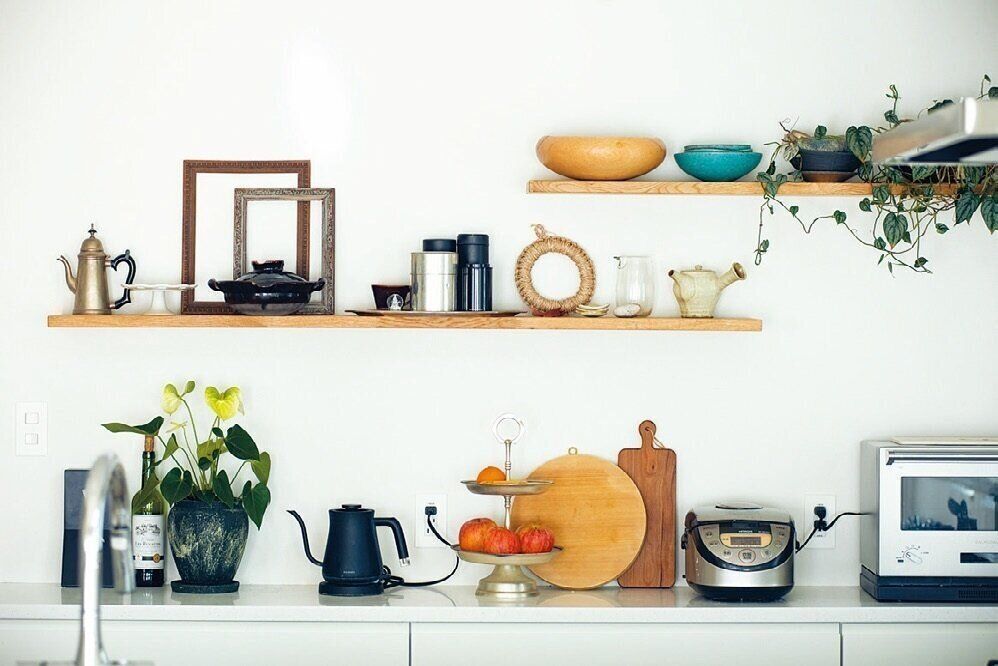 以前は“上手にしまえる自分”を目指していたけれど、やっぱりムリ……そこで視点を変え、“感じよく出しっ放し”にしてみたら片づけなくていいから一気にラクに。コツは、数を絞って素材や色の統一感を出すことです。