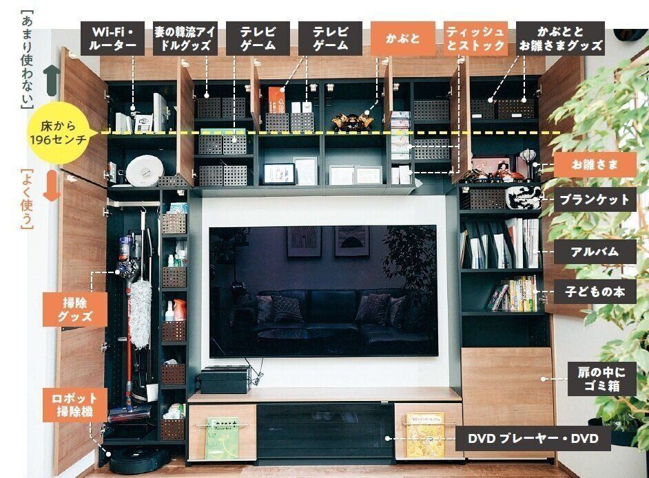 収納王子コジマジックさんの「収納御殿」!家族みんなが即出せて速攻しまえる大容量のリビング収納とは?しまい込まない季節の飾りや、テレビの脇には掃除グッズなど、片づく工夫を詰め込んだ収納を見せてもらいました。