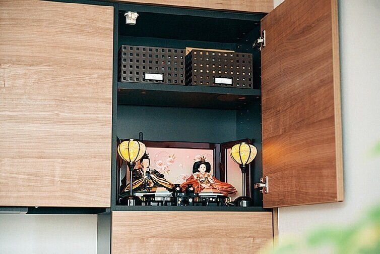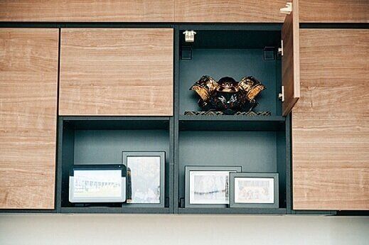 違う部屋の納戸にしまっていたころはお節句のたびに出し入れするのが超絶面倒で。でもここに移したら扉を開け閉めするだけでいい♪かぶともお雛さまも幸せじゃないかな。この収納アイデア、人に話すと「ハ?」って言われますけど(笑)。
