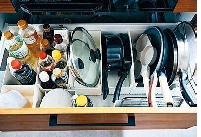 調理道具は「火=コンロで使う物」「水=シンクで使う物」「調理=調理台で使う物」の3つに分け、各エリアにしまうと作業中に必要な物が一瞬で取れて効率UP!