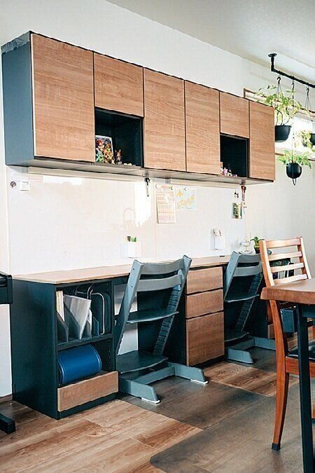 ランドセルは重いから、床に置いて学校準備をしていた我が子。なのでランドセルは低い位置にスライド式の収納をつくり真上に教科書を。