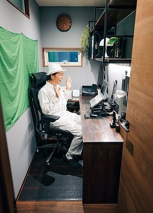 リビングや寝室から離れた1階にこの部屋があるから、家族のじゃまにならずYouTubeの生配信も存分にできる。この狭さも心地よくて狭小住宅だけど作ってよかった。