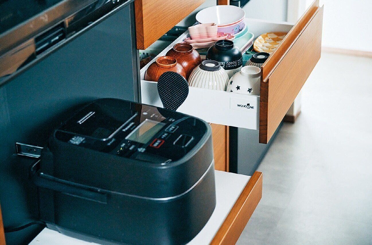 ごはんをよそうのは子どもの役目 炊飯器の真横に茶碗を