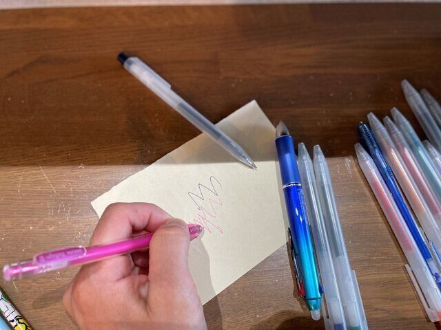 紙に、1本ずつ書いてみましょう。書けないペンを置いておいても仕方ありませんね。もし、書けなくても、手放したくないお気に入りのペンがあったとしたら、どうしますか?芯を変えて、また使いますか?それほどのお気に入りのペンがあれば、それひとつあればきっと十分に足りているかもしれません。