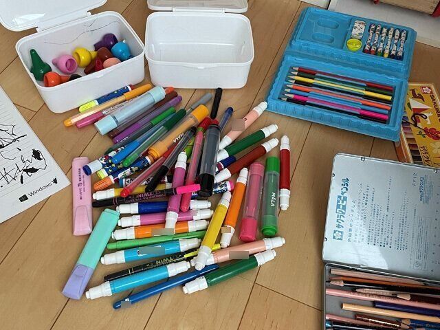 まずは部屋のあちらこちらにあるペンを探して、1つの場所に集めて全部出してみましょう。