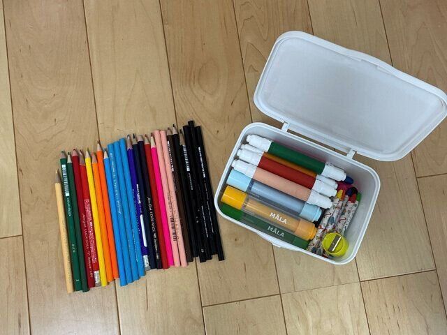例えば、リビングのキッチンカウンターに3色ボールペン1本。子どもたちが良く使うスタディスペースにはカラーペンを。お名前グッズの場所に名前ペン。油性のマジックペンは、普段そこまで頻繁に使わないから…と収納スペースの中に入れる。このように、我が家であればこれぐらいで十分ことが足りそうです。