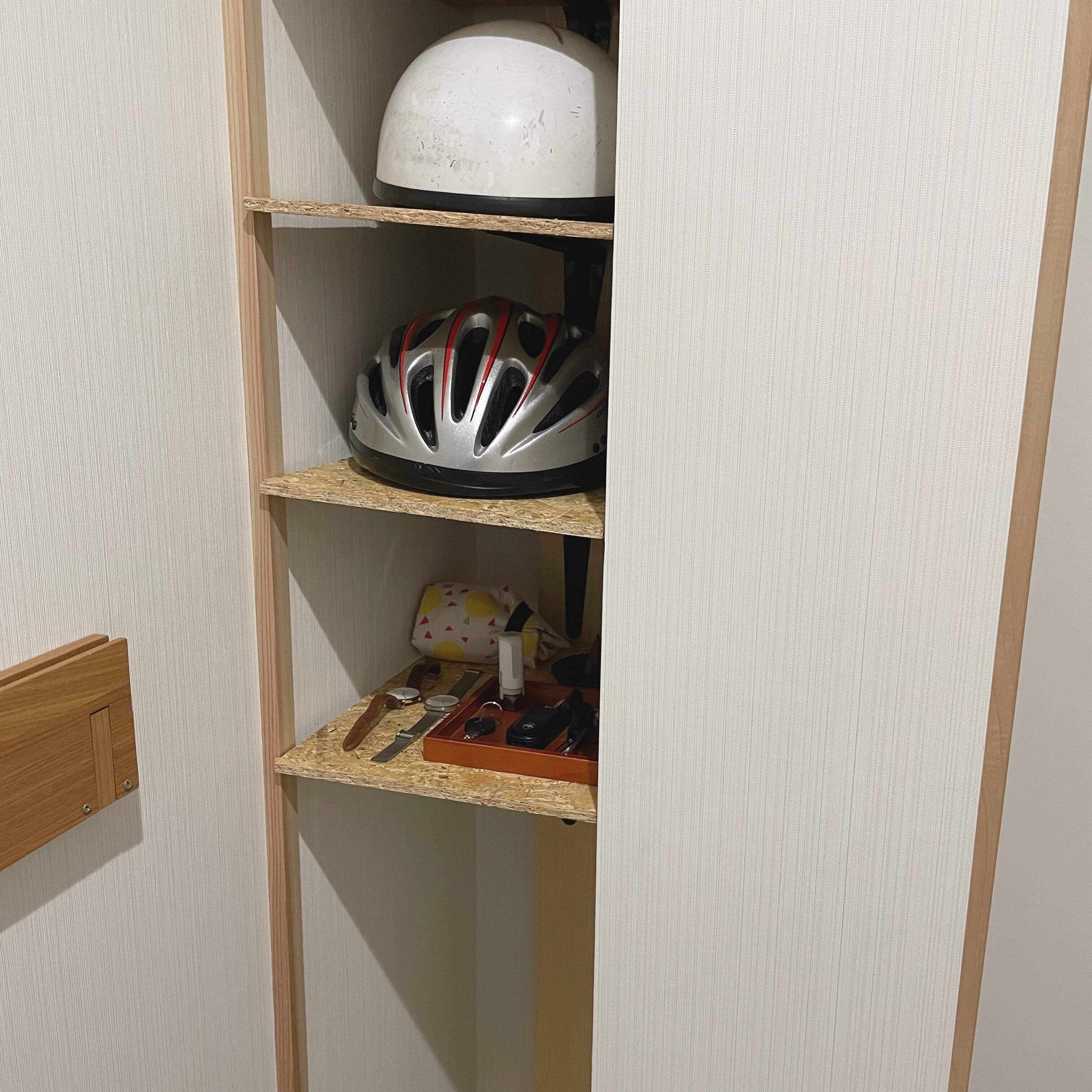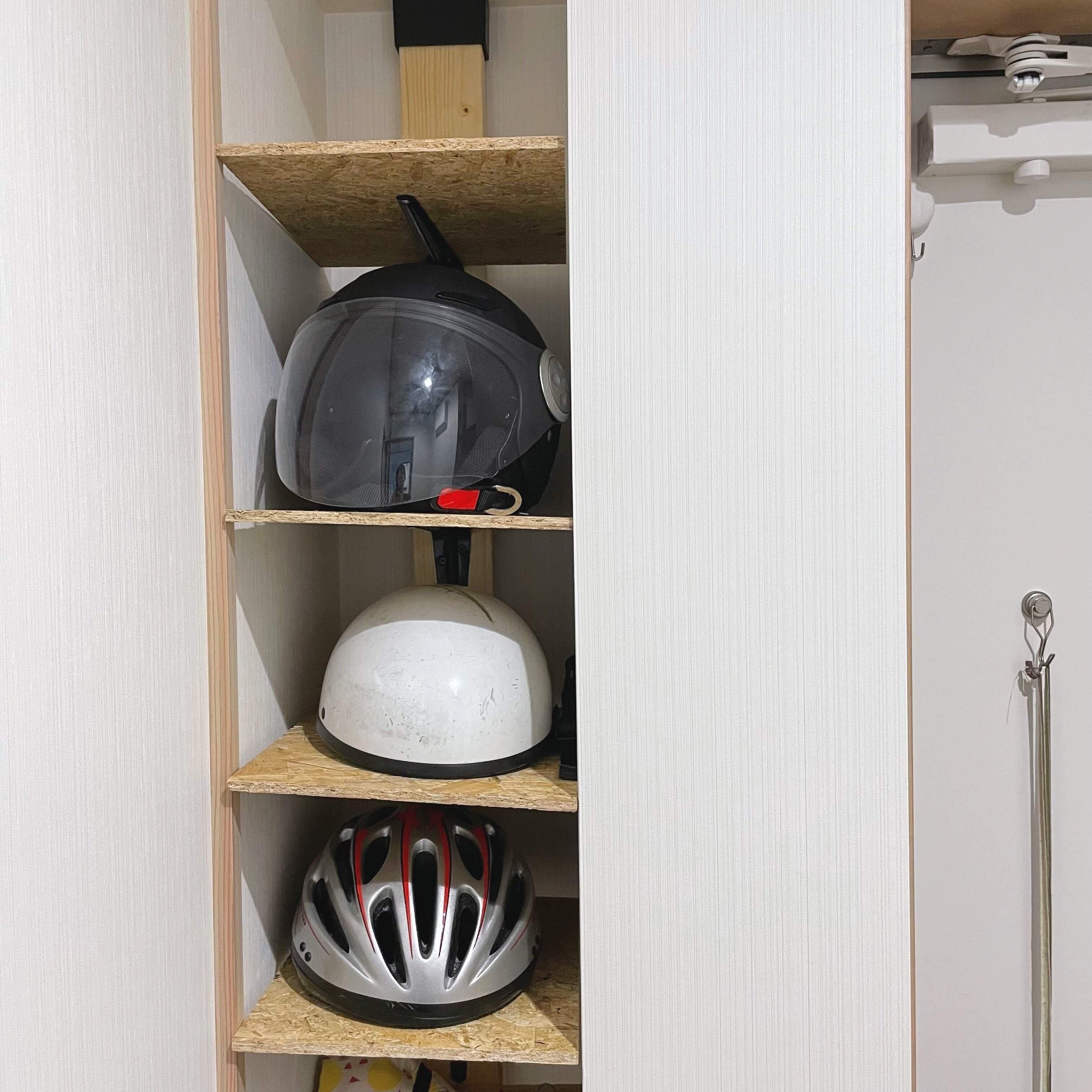 1番頭を悩ませていた「ヘルメット置き場」ですが、デッドスペースにぴったり収まりました。
