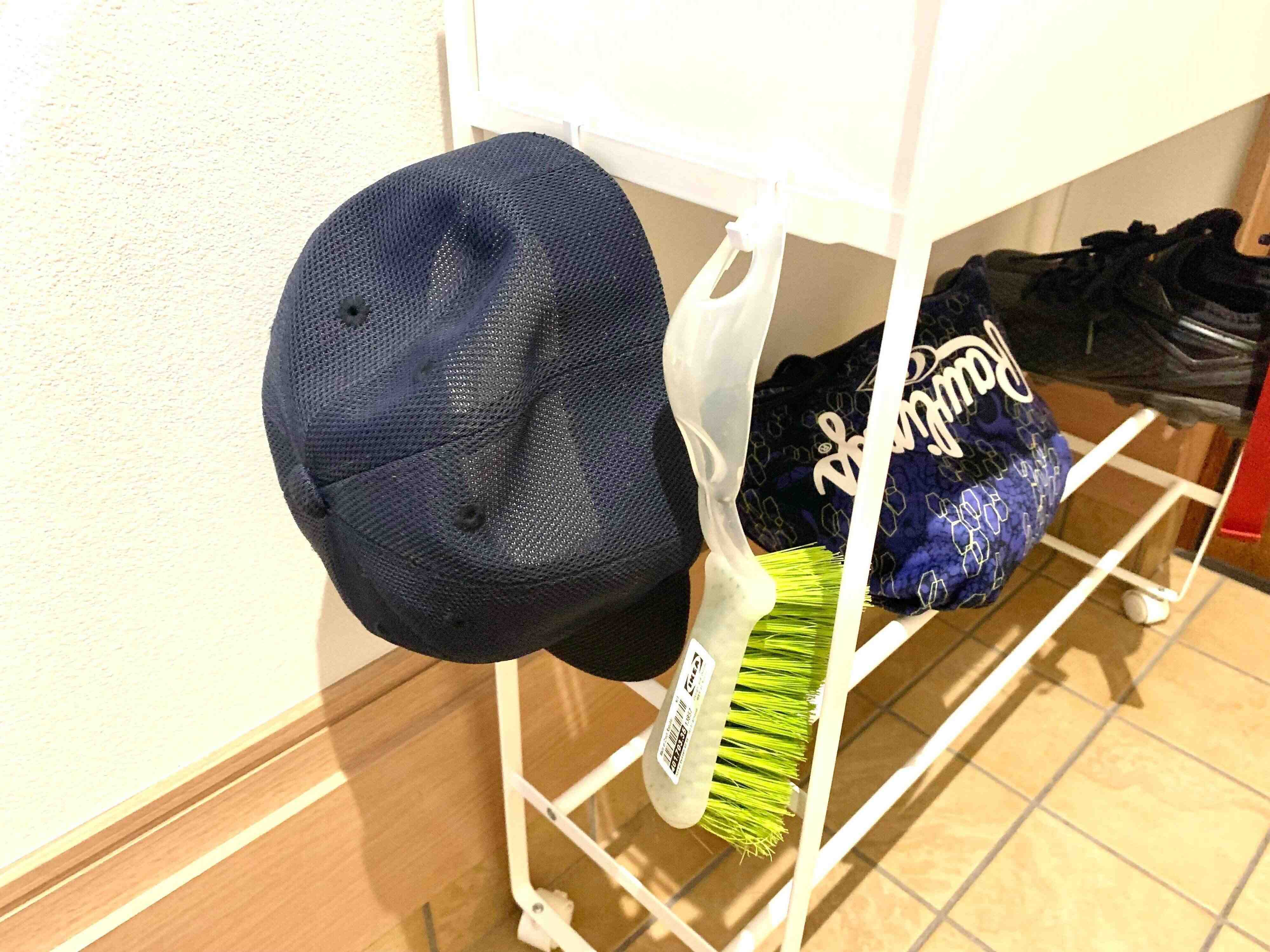 横のフックは帽子をかけています。IKEAのブラシは、ホコリをおとすのに重宝しています。カバンのホコリを落としたり、スパイクを洗うほどでもないときなどに、ホコリを落としたりするのに使っています。ここにかけておくだけで、さっととれて便利です。