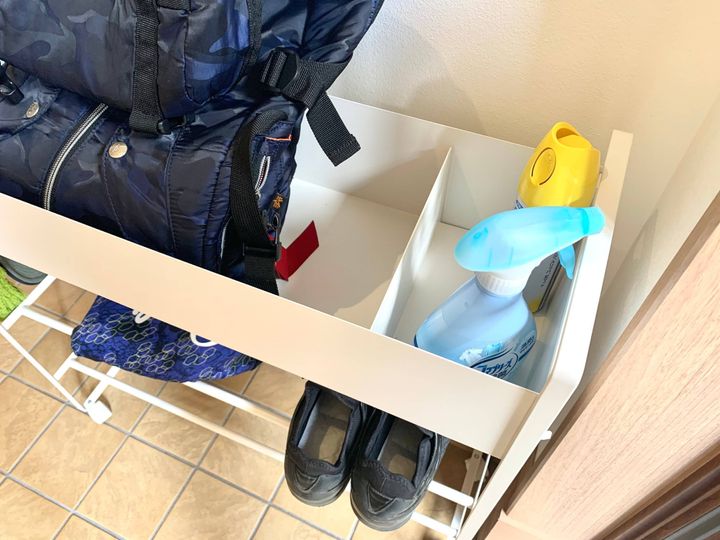 可動式の仕切りがついています。こちらには、帽子やカバンにつかう消臭スプレーや、靴用の消臭スプレーをスタンバイ。