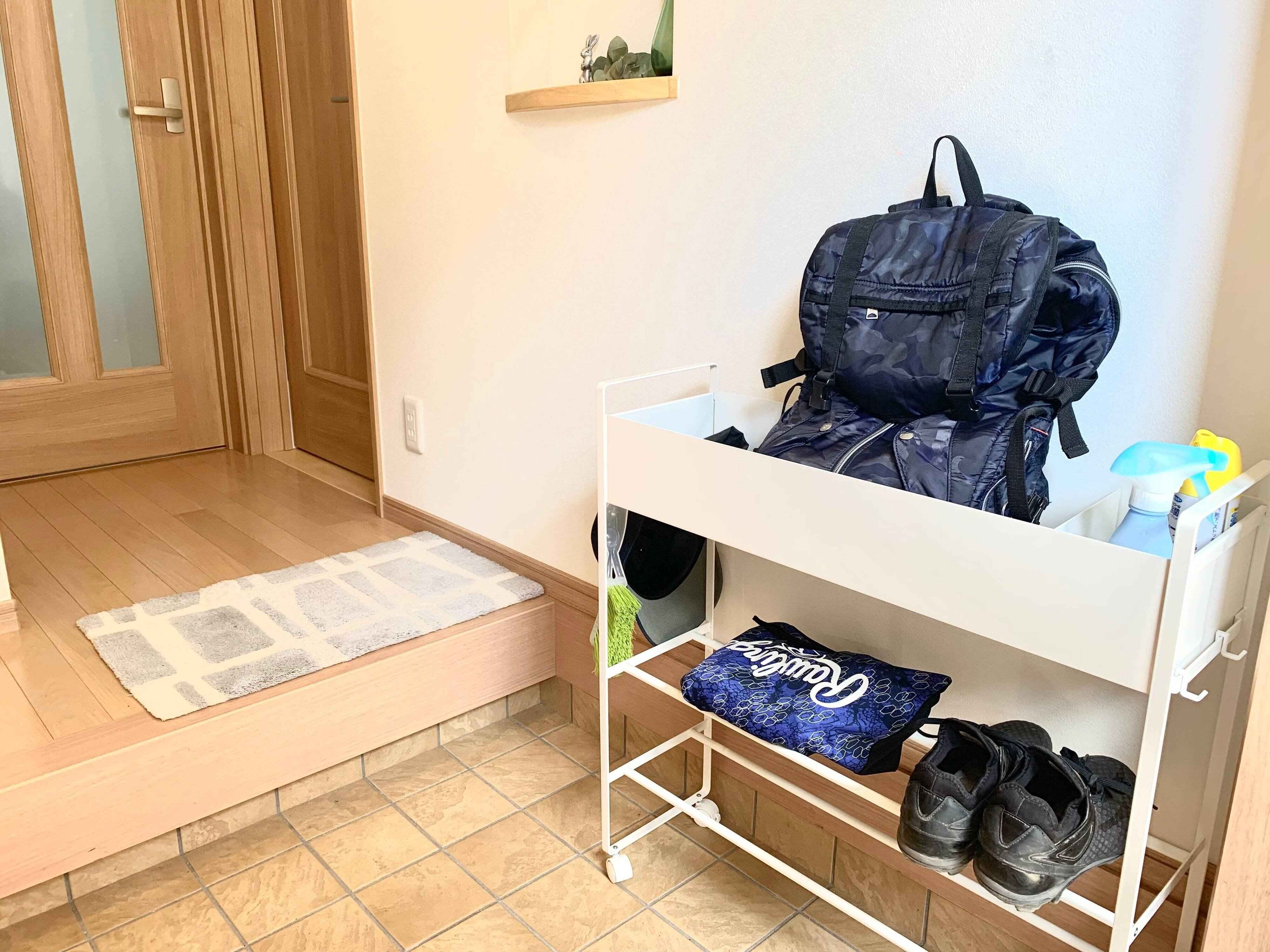 部活カバンを玄関に置くことで、解決!といってもどうやって置く?わが家の玄関は広くないので、下駄箱にカバンをいれる余裕はなく。たとえスペースがあっても、息子が毎回下駄箱をあけて、カバンをしまうとは思えず。