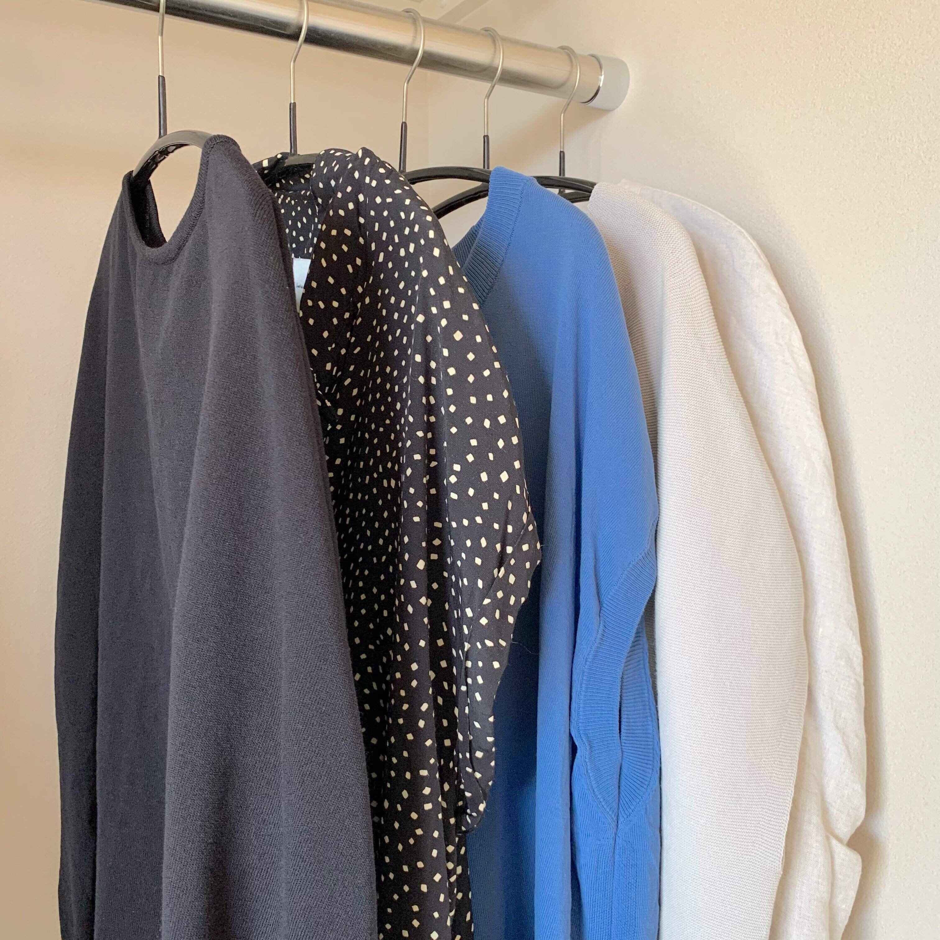 私は仕事で人前に出ることが多いため、平日5日分の組み合わせは持つようにしています。具体的には、トップス5枚とボトムス5枚です。そのほかに、休みの日に家事がしやすい服を2日分持つと決めています。