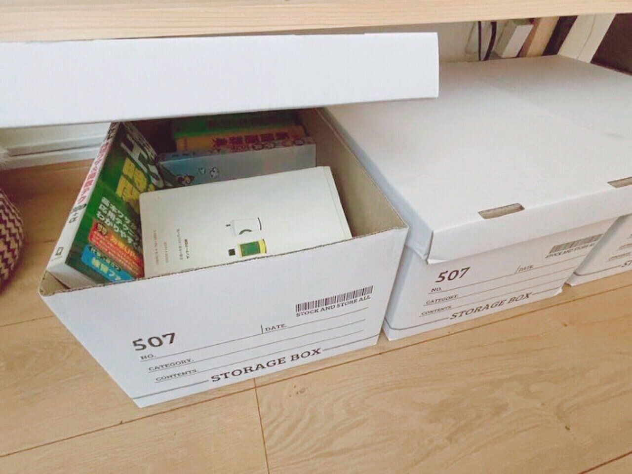 厳選された本たちは、100均で購入したダンボール収納箱に入れてテレビ下に置いています。