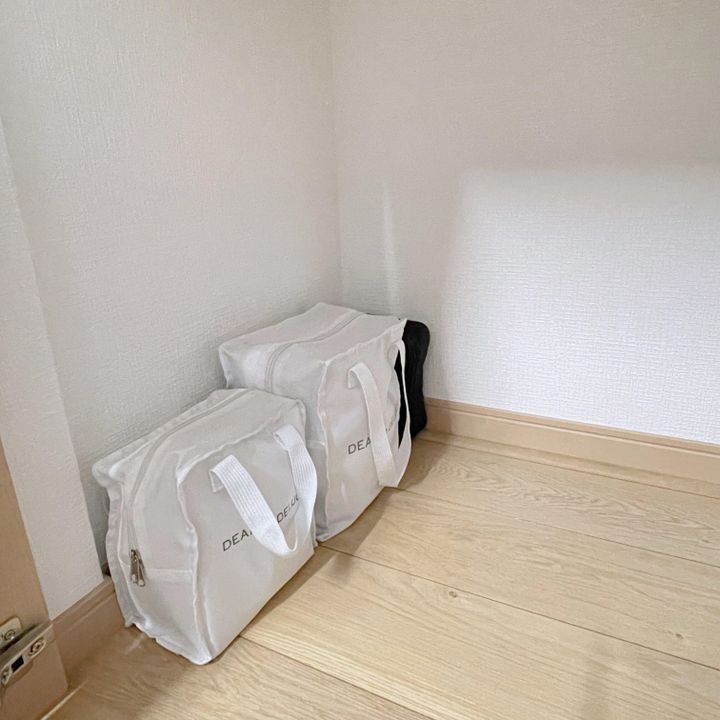 私は、シンプルデザインがお気に入りの保冷バッグにまとめて、キッチン近くの収納に置いています。