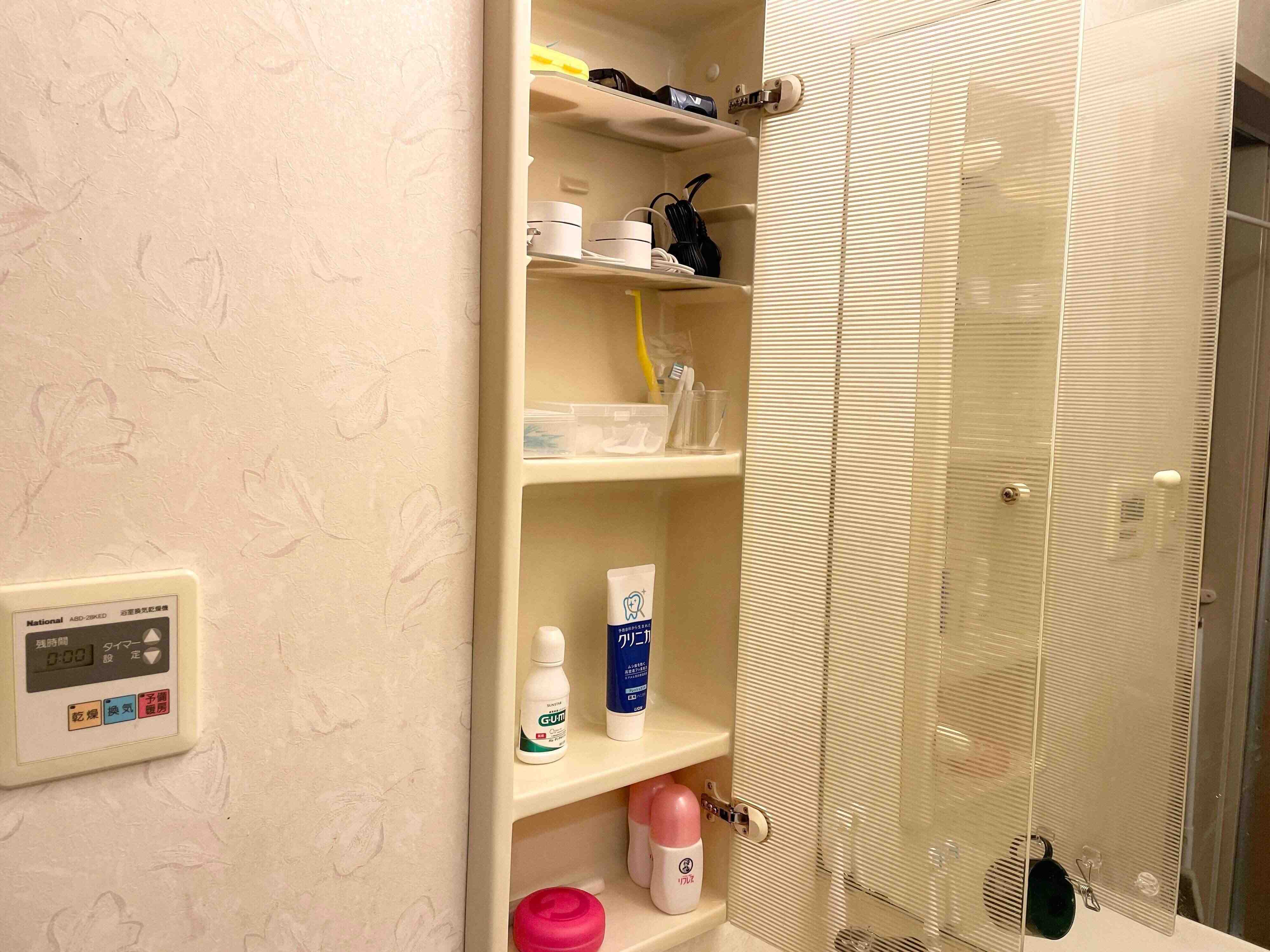 我が家の洗面台は鏡面裏収納ではなく、壁面にある半透明の扉がついた棚。ここを片づけていきますよ。