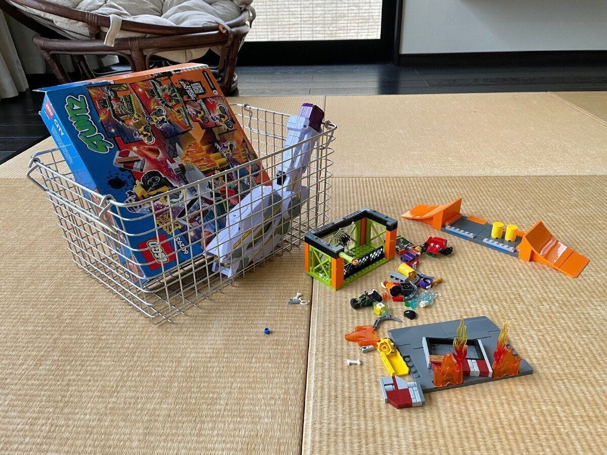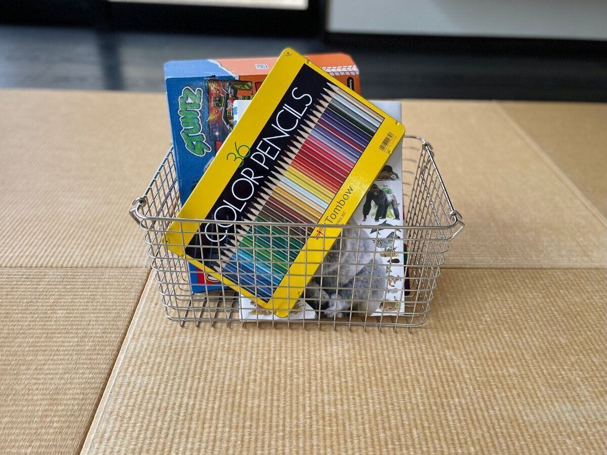 使ったおもちゃをおもちゃ棚に戻すのではなく、カゴの中に入れるようにしました。