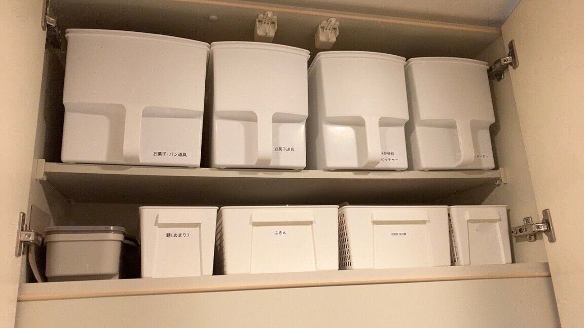 ここには吊戸棚ボックスをいれていますが、すでに中はものでいっぱい。新しいものがはいる余裕はありません。でもお菓子作りのグループとして一緒に収納しておきたいです。